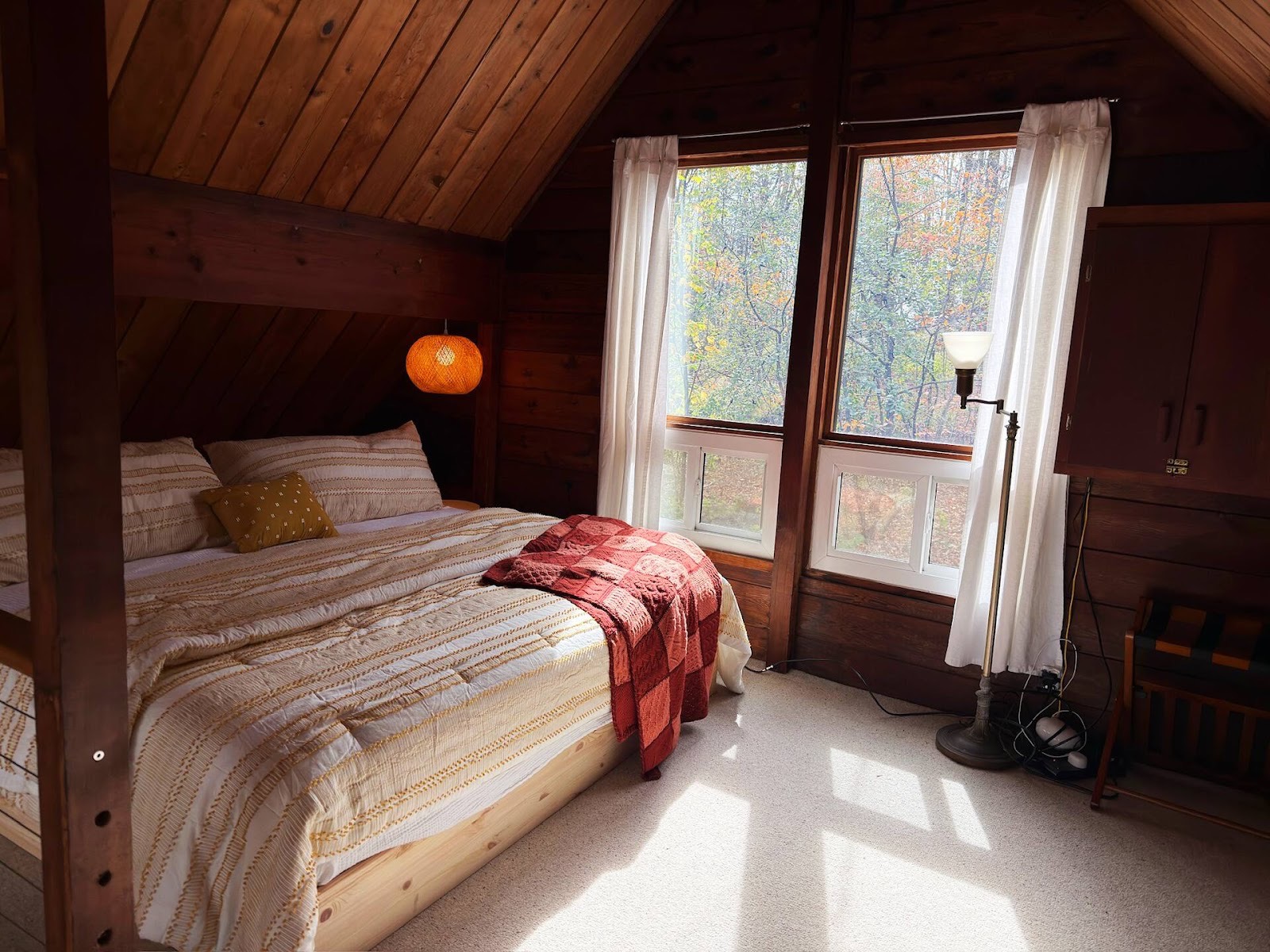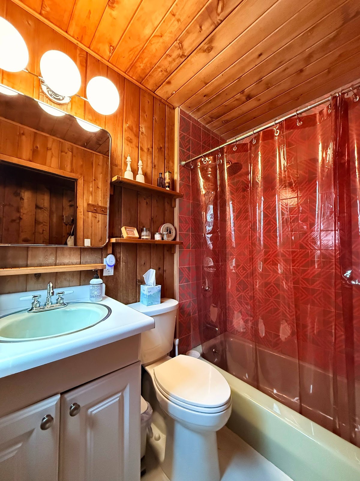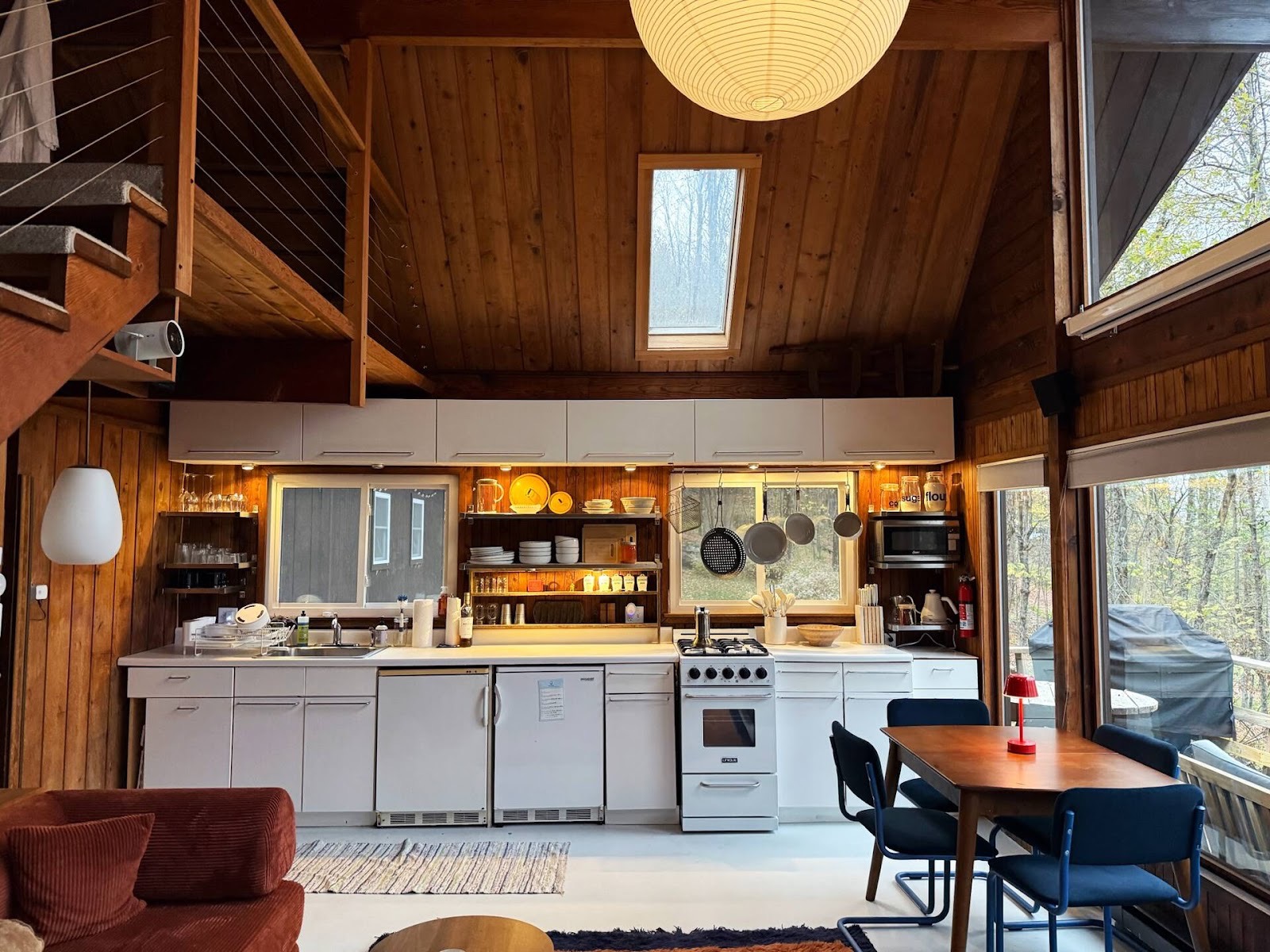 The chalet’s architecture is the first thing you notice. Vaulted ceilings rise above the living room, drawing the eye upward along warm cedar beams. The wood paneling, untouched yet perfectly preserved, catches the morning light in soft honey tones. Windows frame the surrounding trees, letting nature inside without ever overwhelming the space. At the center, a wood-burning stove anchors the room, its handmade tile backsplash a subtle work of art, delicate and geometric, grounding everything around it. The lighting—carefully curated sconces and pendants—highlights the texture of the walls, the grain of the ceiling, the angles of the beams, revealing beauty in places most houses leave plain.