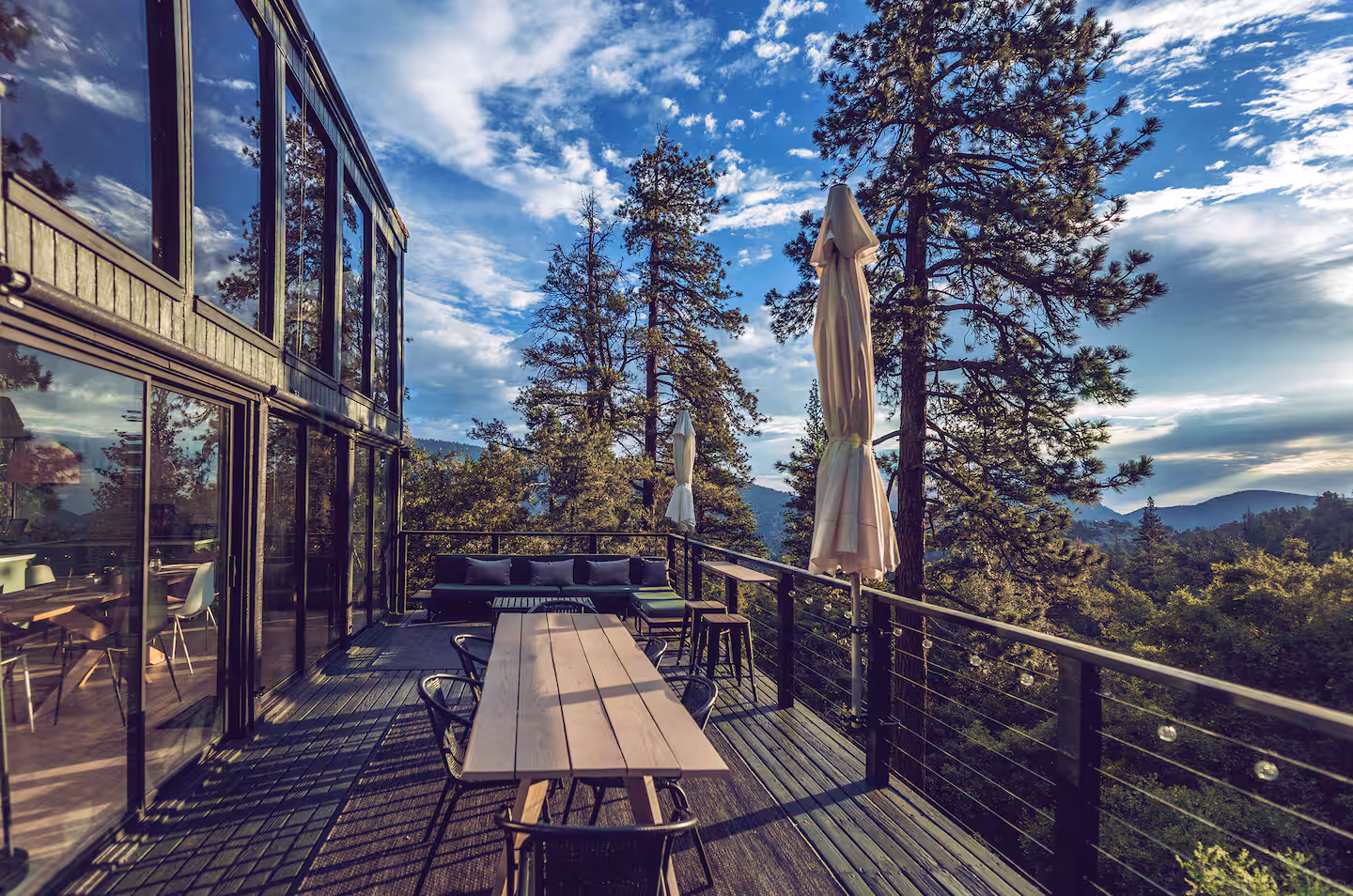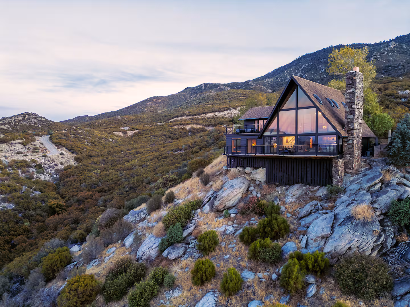 An A-Frame Above the World sits within the Santa Rosa and San Jacinto National Monument, on a hillside above Mountain Center, surrounded on all sides by protected wilderness. The approach is unhurried — a road that narrows as it climbs, the desert valley dropping away to the south, snow-dusted peaks rising to the north. By the time the A-frame comes into view, rising from its hillside with the quiet structural confidence of a building that has always been here, you have already begun to decompress.