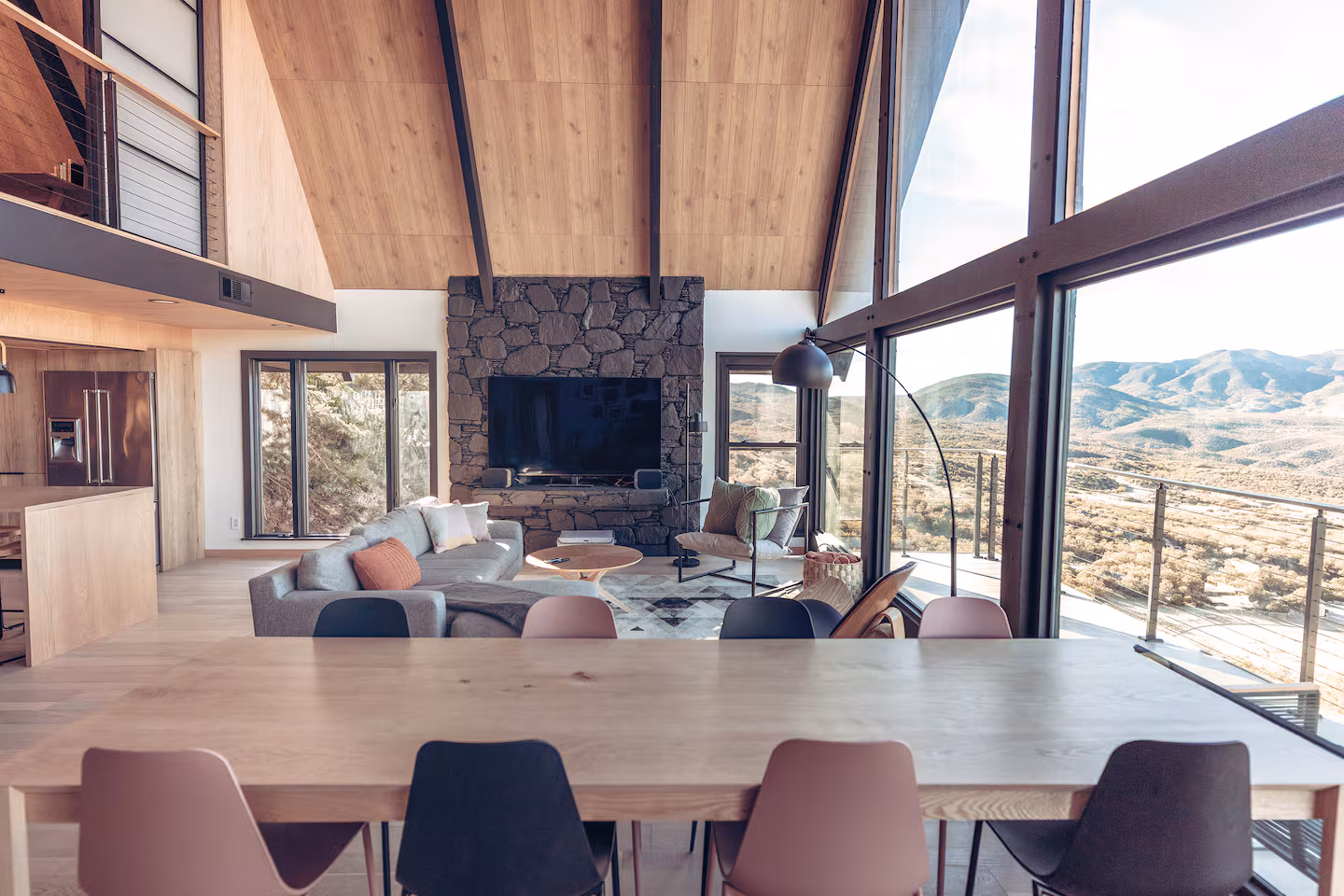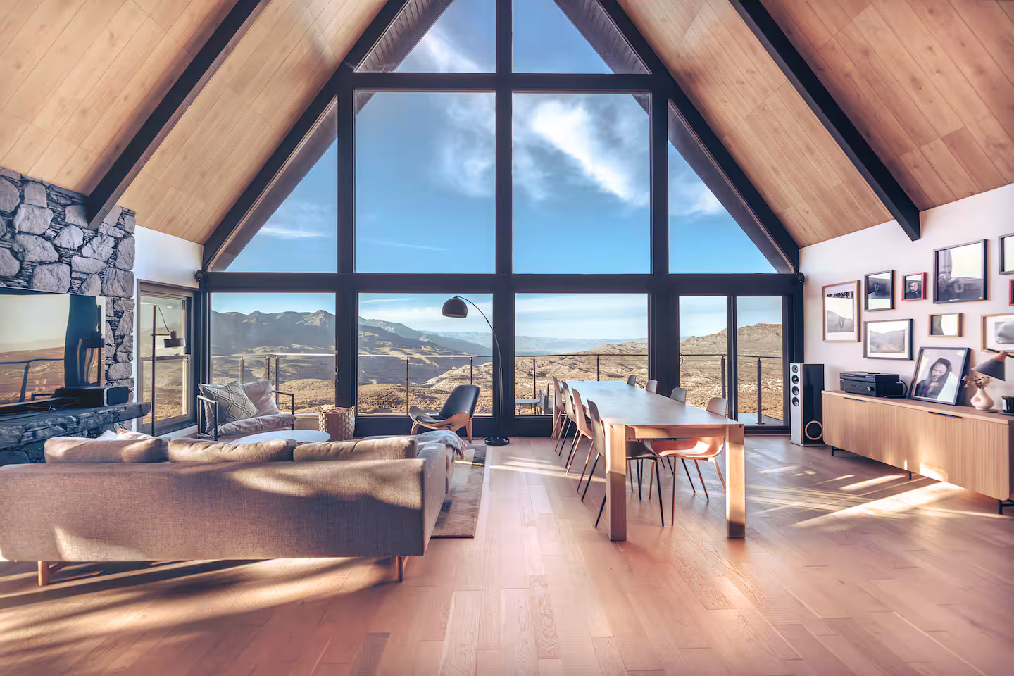 The A-frame structure rises to thirty feet at its apex, and the interior holds all of that height. Floor-to-ceiling glass fills the southern face, pulling the desert valley directly into the room — the Palm Desert floor glowing below, the mountain peaks pressing in from above, open sky in every direction. To stand in this living room is to feel genuinely elevated, genuinely apart.