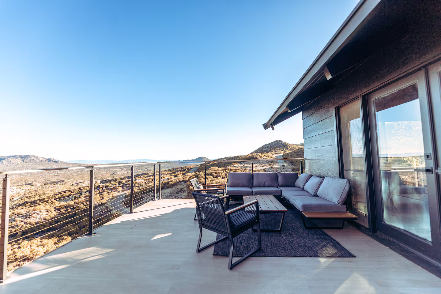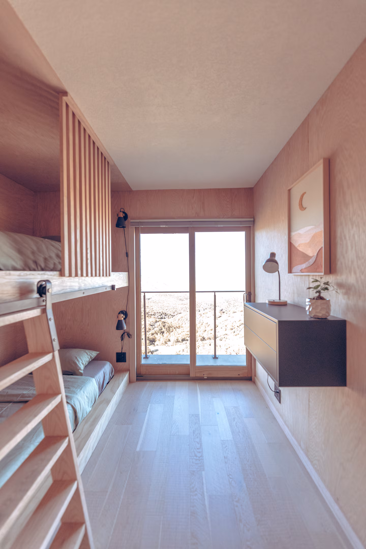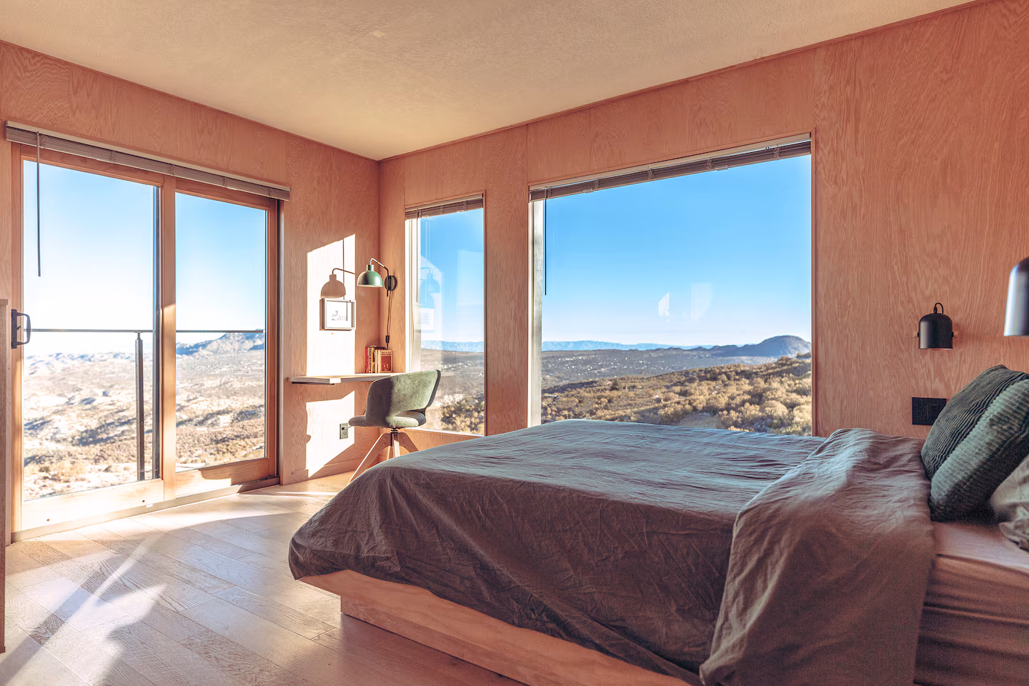 The Lavender Room faces east onto a 400-square-foot private patio — a room that is essentially two rooms, the indoor space and the terrace being equally usable and equally considered. Morning light arrives here first. The Sage Room places the desert at the centre of every angle, its window positioned with the same precision as every other aperture in the house — not to fill a wall, but to frame a specific moment of the view. A fourth room with custom-built bunks is sized generously enough for adults who don't want to feel like they've been given the children's room.