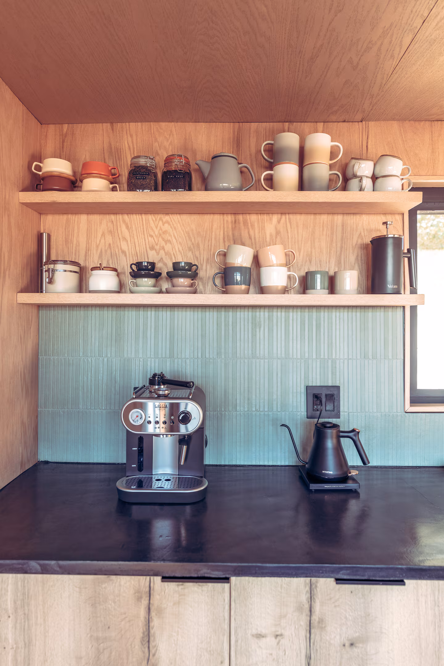 The kitchen arrives fully stocked and equipped, the espresso machine included. The pantry is ready before you are. The record collection — built over years, brought here from their own shelves — sits by the player.