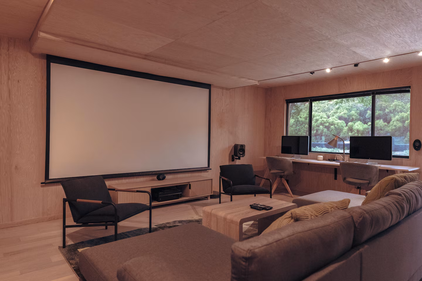 Downstairs, away from the light, a cinema room with a 135-inch screen and a professional JVC 4K projector with full surround sound. The contrast with the view-saturated rooms above is intentional — a space of deliberate enclosure, where the outside world is set aside in favour of something else entirely. It is, in the logic of the house, the only room that isn't about the landscape.