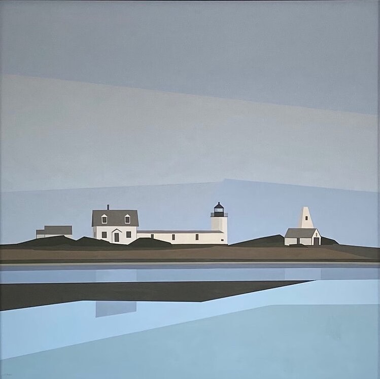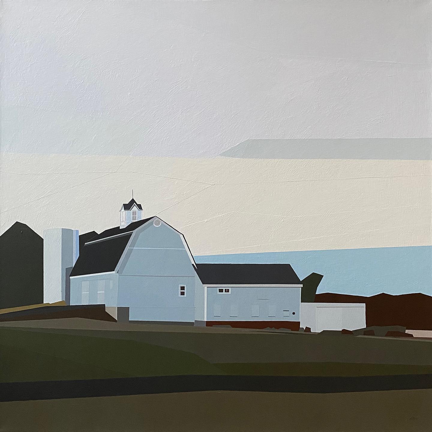 Architecture is central to his practice. Homes, barns, and coastal structures appear as simplified forms defined by strong lines and planes. Roofs become angles, walls flatten into geometric shapes, and windows act as compositional anchors. But Roes isn’t documenting specific places; he’s exploring how buildings organize space. Cropped perspectives, clean edges, and carefully chosen color introduce rhythm and motion, allowing each composition to feel active while remaining restrained and deliberate.