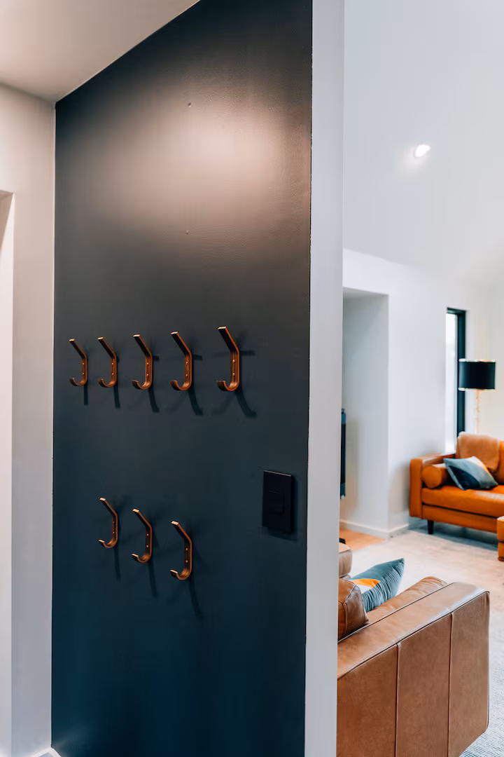 Downstairs, two bedrooms ground the home. One queen room looks toward the mountains; the second features custom-built bunks with individual reading lights and USB ports — tailored, modern, and quietly refined. A secondary lounge connects the rooms and opens directly to the outdoors.