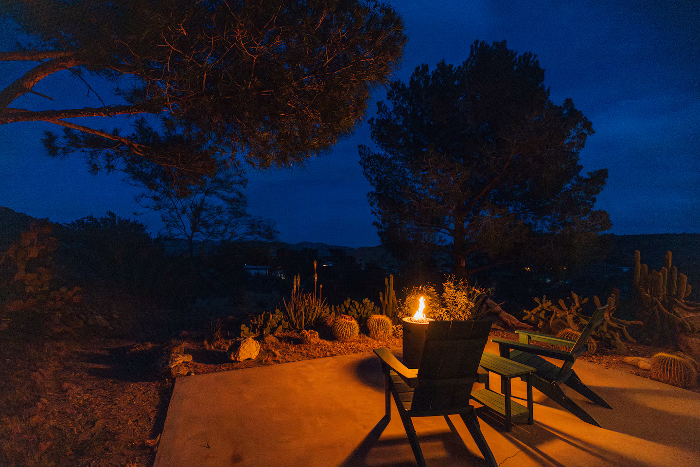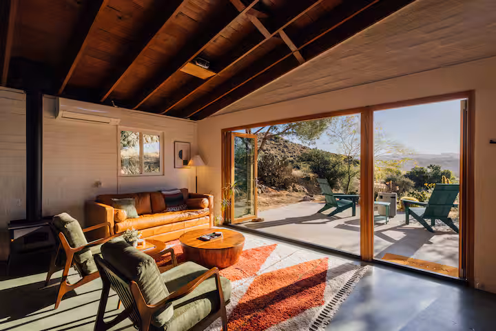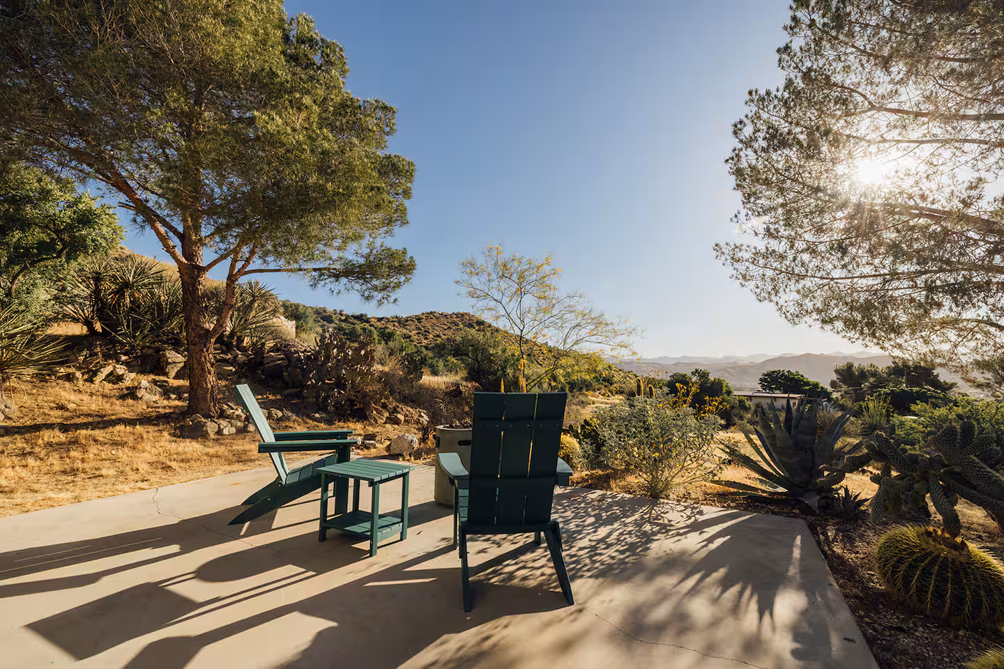 Mockingbird Villa is a midcentury hideaway between Palm Springs and Joshua Tree, set on a hillside near Big Morongo Canyon Preserve. Surrounded by cactus gardens, pine trees, and open desert sky, the home is designed to dissolve the boundary between interior and landscape.