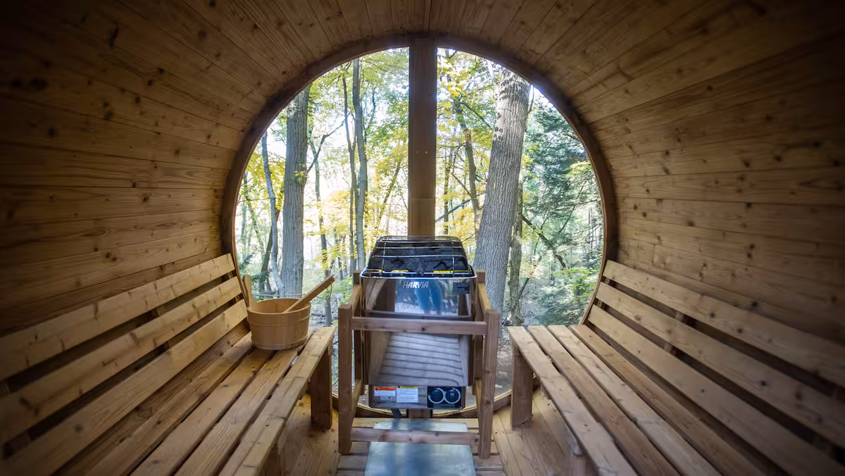 Step outside to the deck overhang, patio hot tub, outdoor sauna, and firepit, all set amid the peaceful Michigan woods.