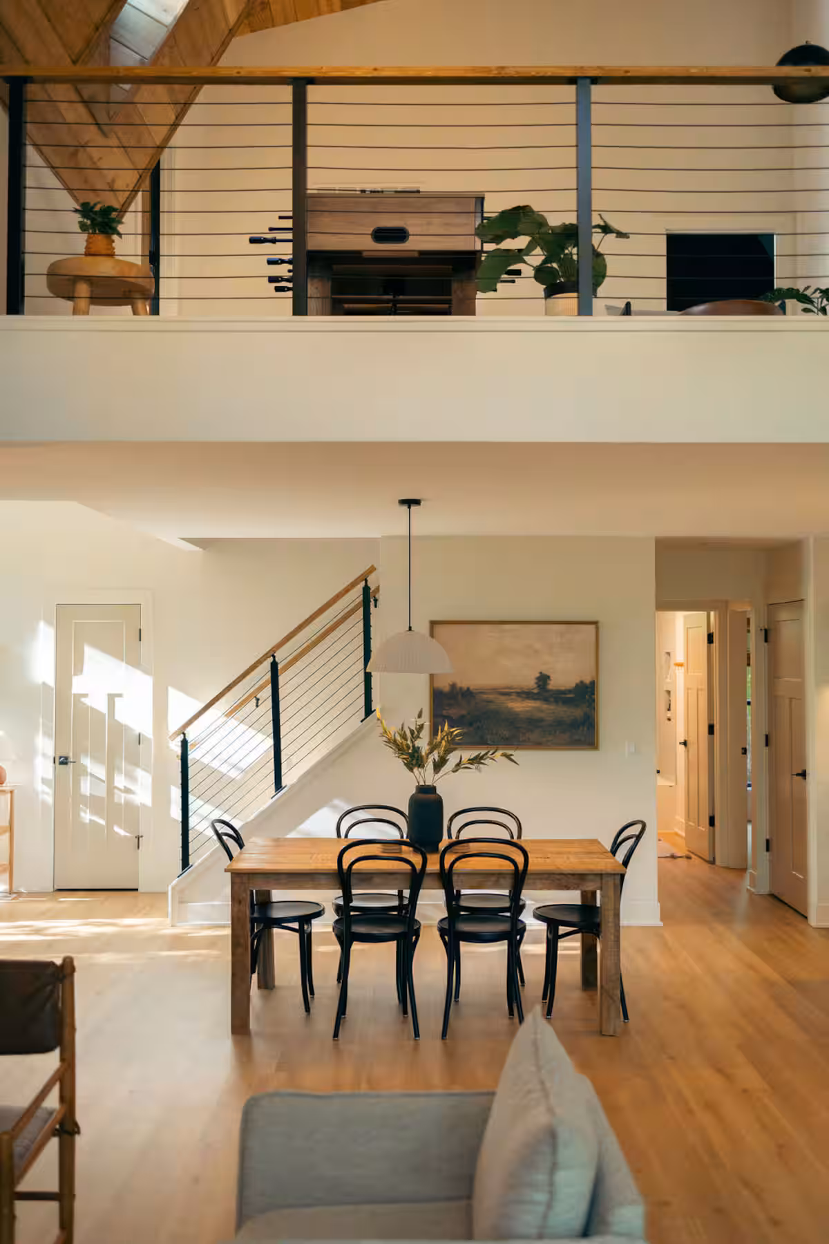 Up one flight of stairs, guests enter the game loft, which overlooks the family room. The east dormer houses a private office with a large picture window—perfect for remote work or creative projects. On the west side of the loft is the master bath wet room, featuring a vaulted cedar ceiling, a skylight, a rainfall shower, and a soaking tub. The master suite itself includes a king bed, a reading nook, large picture windows, and 20-foot vaulted ceilings.