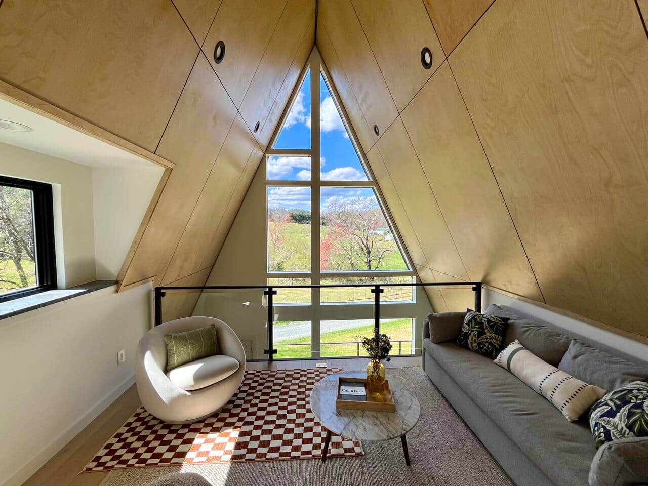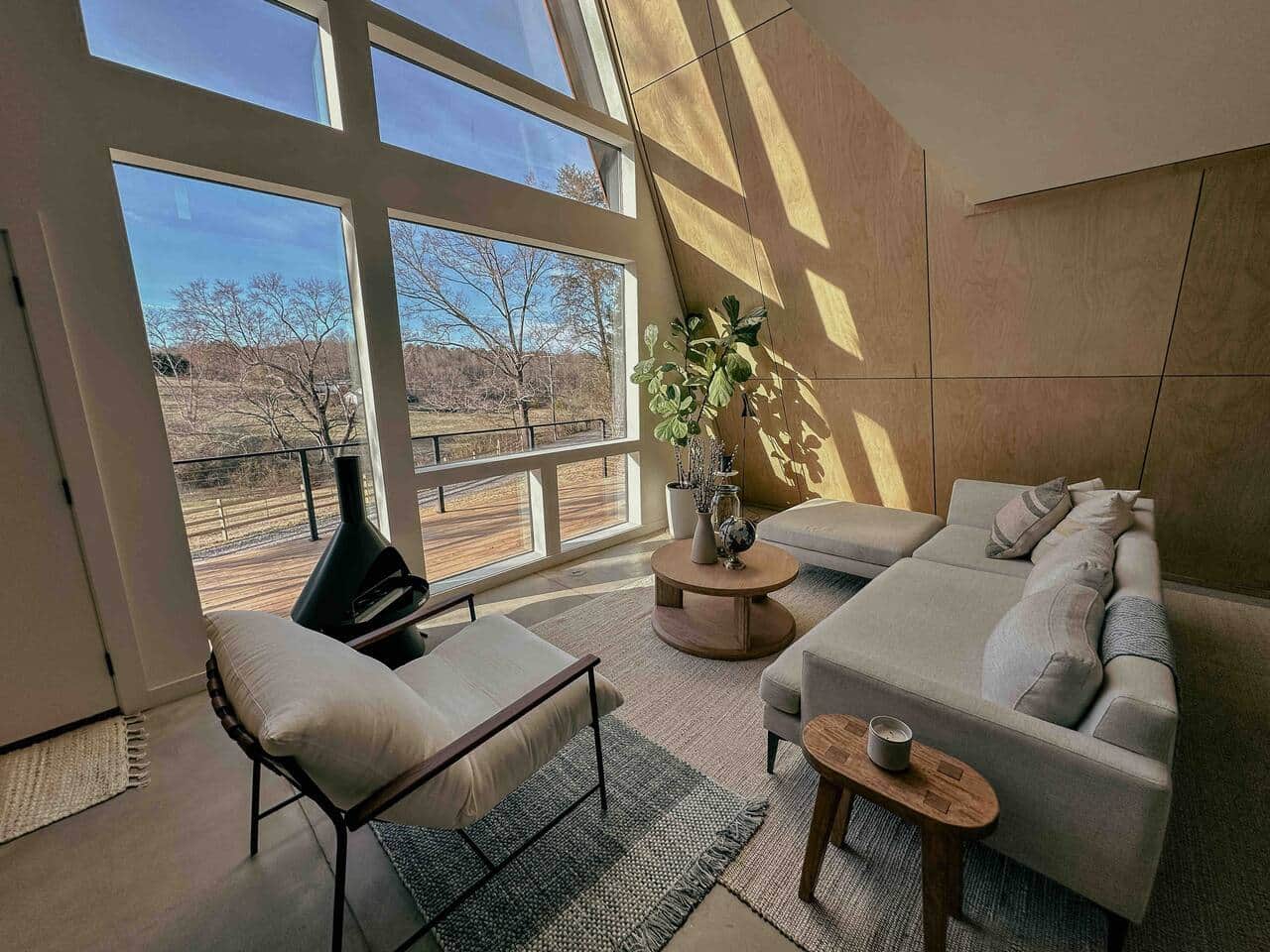 Tucked into the rolling green of the farm about 1.5 hours from Atlanta, the drive gradually dissolves city noise into winding rural roads until the cabin appears almost suddenly, sitting quietly within the land. Inside, it's a study in restraint and warmth. Maple ceilings, natural textures, and oversized glazing create a feeling that's both minimal and deeply inviting. Everything is intentional, but nothing feels rigid. Mornings stretch longer here, and evenings end in the hot tub under open sky.