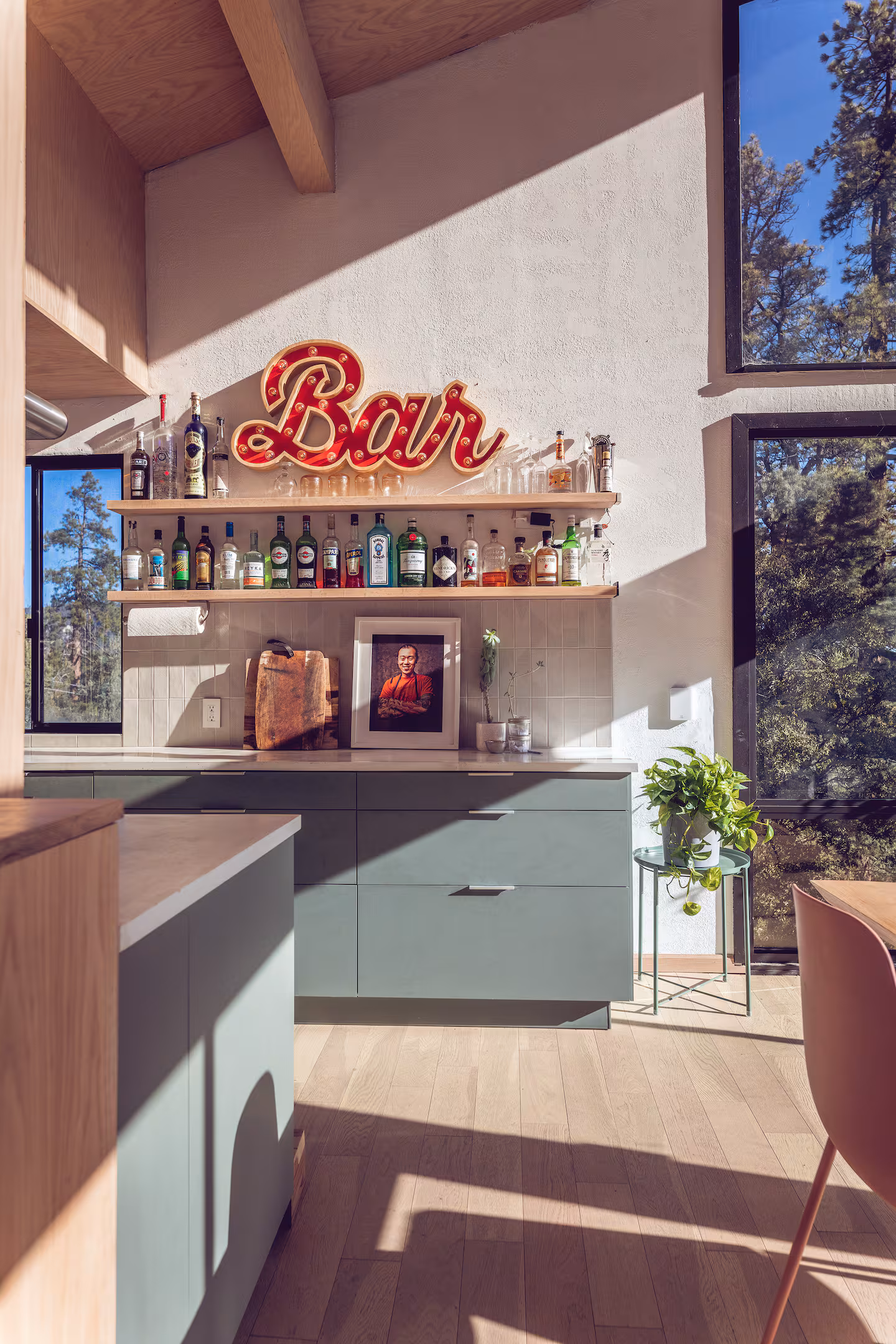 Floor-to-ceiling windows on the eastern, northern, and western faces frame the surrounding ridgeline like moving paintings. At 20 feet, the ceilings lift the living space into something almost ceremonial. Morning light enters the kitchen and dining area early, catching the grain of a custom solid oak table — handcrafted, generous, built for long meals and unhurried conversation. Majority of the furniture throughout the home is bespoke, designed with the kind of quiet confidence that comes from owners who know exactly what they love.